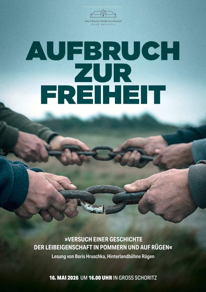 Am Samstag, 16. Mai 2026 begrüßen wir ab 16:00 Uhr den Leiter der Hinterlandbühne Boris Hruschka im Arndt-Haus in Groß Schoritz mit einer Lesung in kurzen Auszügen aus diesem Werk von Arndt. Doch nicht nur das – es geht immer auch um die Bezüge zum Hier und Heute. Was besagt ein „Aufbruch zur Freiheit“? Mit wieviel Eigenverantwortung geht dies einher? Ist „Zuversicht“ das richtige Wort, um heutiges politisches Bemühen als positiven Beitrag zum eigenen Leben anzuerkennen?
