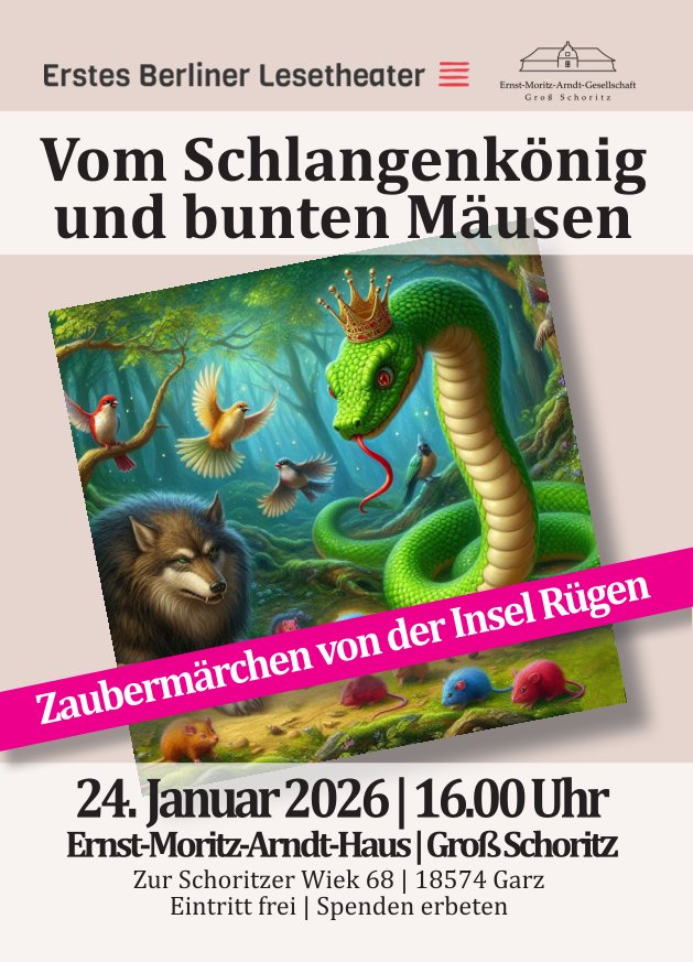 Das Erste Berliner Lesetheater unter Leitung von Dr. Thomas Rau liest am Samstag, 24. Januar 2026, ab 16.00 Uhr spannende, anrührende, aber auch furchterregende Geschichten von Ernst Moritz Arndt – jede voller Geheimnisse und Magie.