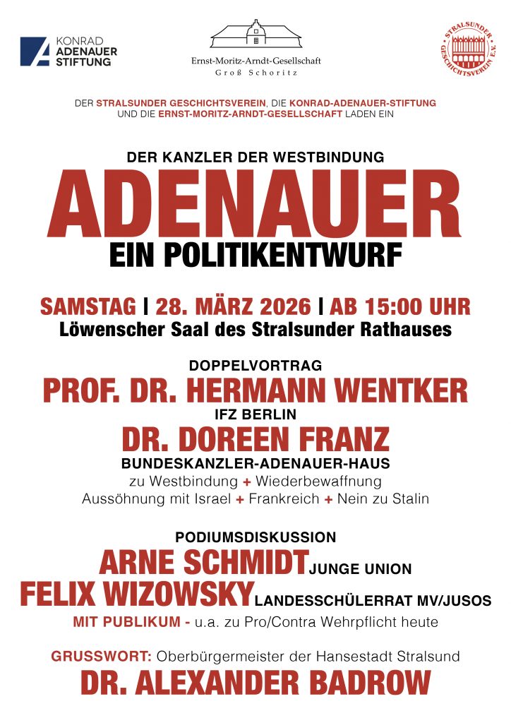 Darum dreht sich eine Veranstaltung der Ernst-Moritz-Arndt-Gesellschaft in Kooperation mit dem Stralsunder Geschichtsverein und der Konrad-Adenauer-Stiftung am Samstag, 28. März 2026, ab 15:00 Uhr im Löwenschen Saal des Stralsunder Rathauses. Seien Sie dabei.